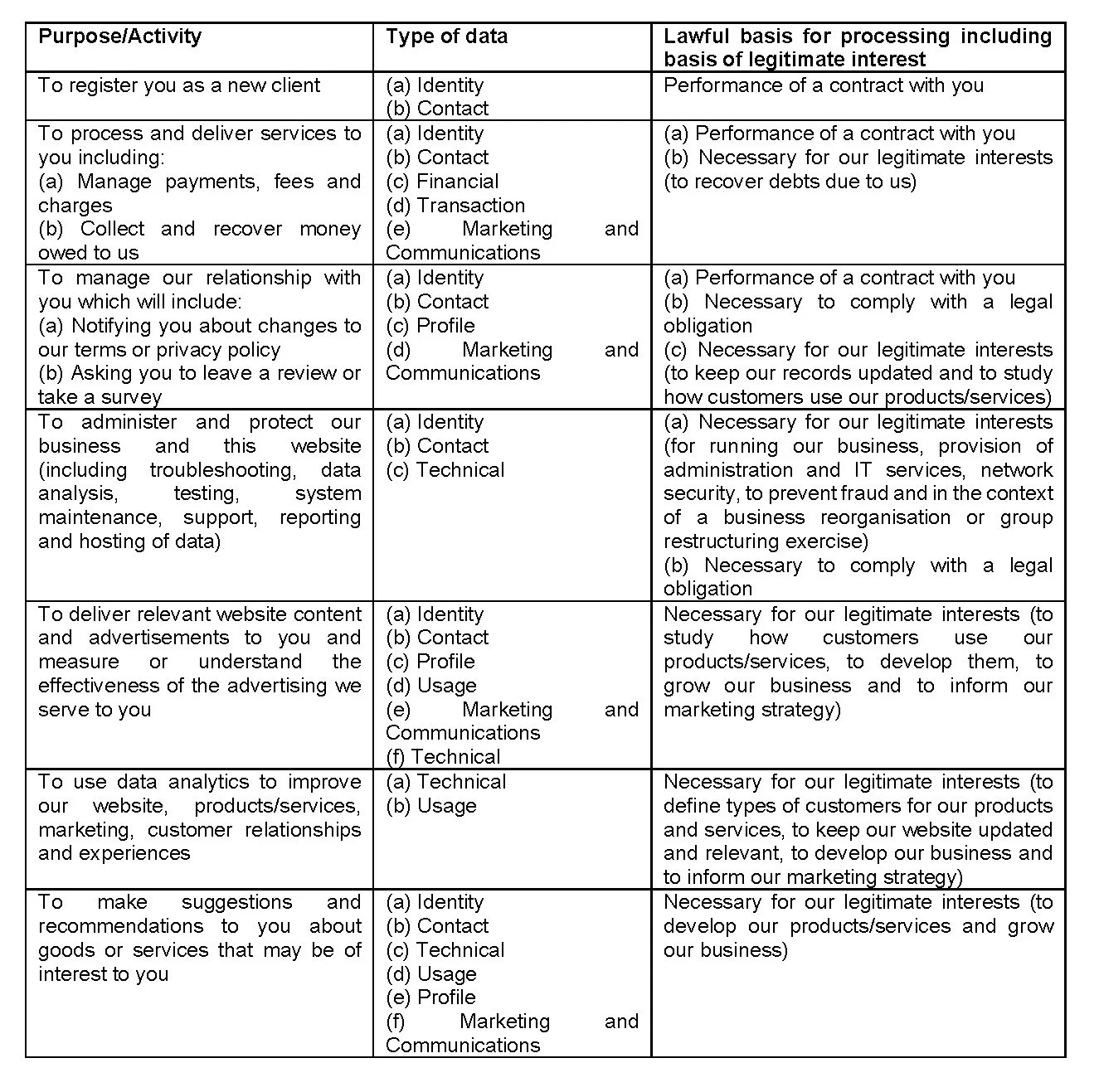 We have set out below, in a table format, a description of all the ways we plan to use your personal data, and which of the legal bases we rely on to do so. We have also identified what our legitimate interests are where appropriate.